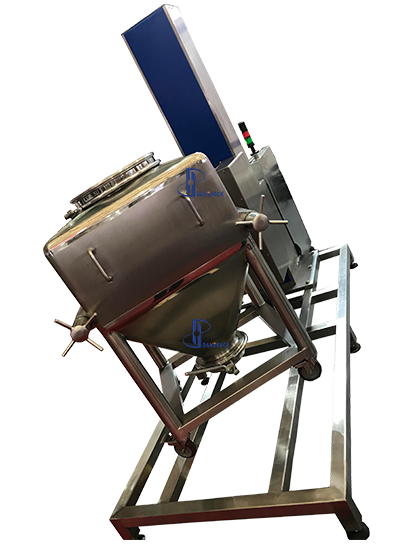 2,回轉(zhuǎn)體(混合料斗)與回轉(zhuǎn)軸線成30°夾角,混合料斗中的物料隨回轉(zhuǎn)體翻動外,同時沿斗壁做切向運(yùn)動,產(chǎn)生 強(qiáng)烈的翻轉(zhuǎn)和高速的切向運(yùn)動,從而達(dá)到混合效果。
